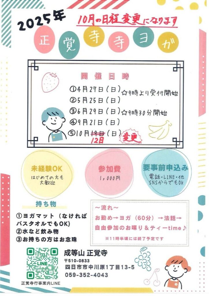 - 流れ:お勤め→ヨガ(60分)→法話
